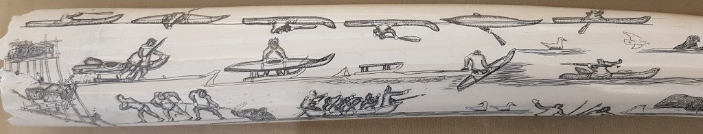 I slowly circled a glass-topped display, peering at the carved walrus tusks from every angle. Intricately etched scenes depicted walrus on ice floes, men in canoes and boats, and caribou, seals, birds and polar bears. Others had three-dimensional figures – polar bears, seals and Arctic foxes – on pegs that slotted into holes in the tusks and I imagined the hours they must have taken to carve, perhaps as ferocious winds raged outside, or northern lights wavered overhead during long winter nights.